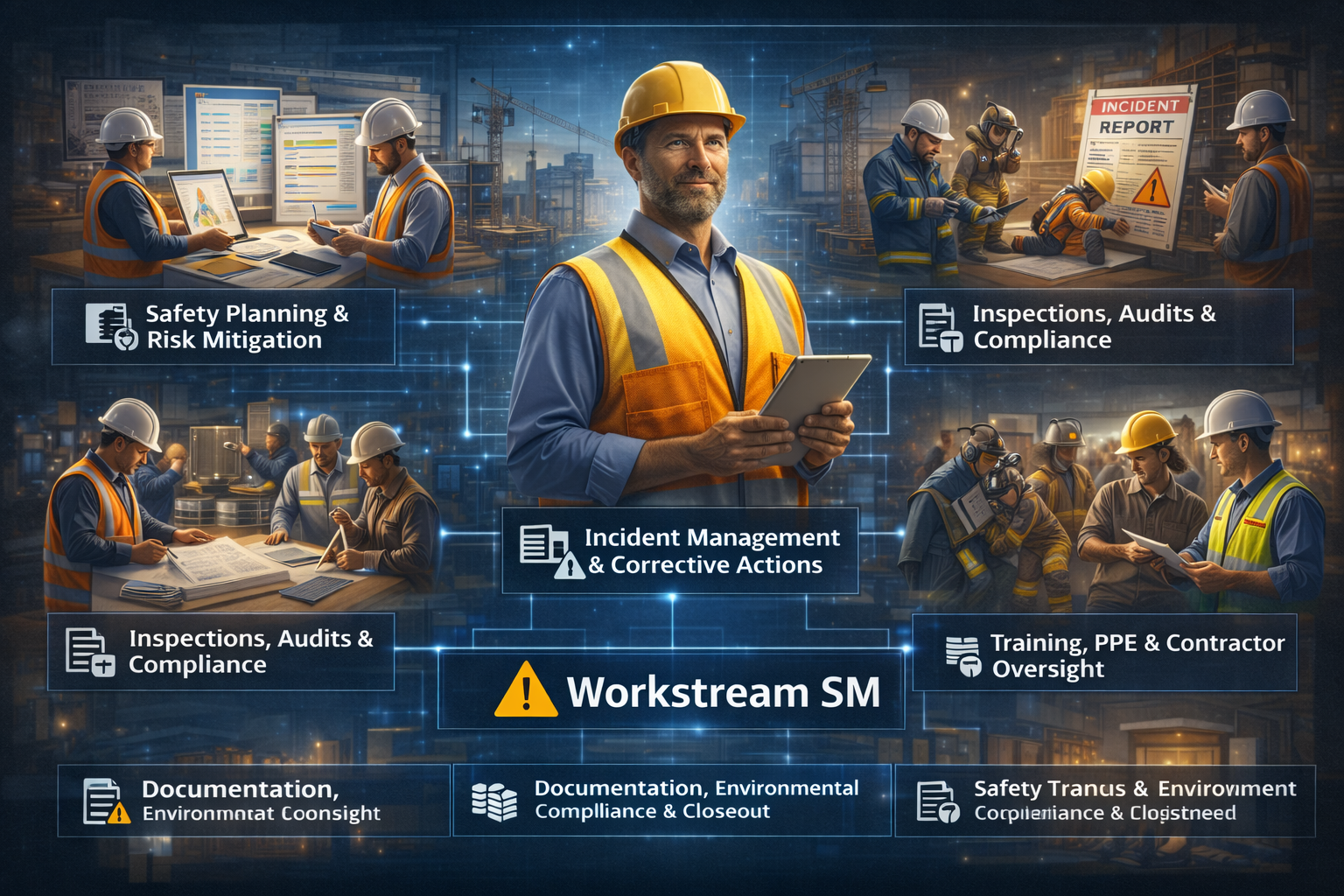 Workstream SM delivers proactive safety management that ensures every phase of a project is executed with discipline, compliance, and accountability. By integrating with project teams from pre-construction through close-out, it establishes a culture where hazards are identified early, risks are mitigated, and safety is continuously reinforced. This approach protects people, maintains regulatory compliance, and ensures projects are delivered without incident.